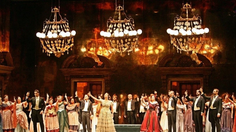 Casa de Violetta Valéry, la nobleza y cortesanas liberan los corazones durante el banquete; la protagonista quiere ser como Hebe, la escanciadora de los dioses; su enamorado, Alfredo Germont, entona: Bebamos en las chispeantes copas… Libemos al amor, que en las copas más cálidos besos hallará. Todos le responden: ¡Ah! ¡Gocemos…! La copa y el canto embellecen la noche y la sonrisa… (Verdi, LA TRAVIATA, acto I). El domingo de Resurrección, el soldado Turiddu invita a los vecinos del pueblo a probar el vino de la nueva cosecha: Viva el vino espumoso. (Mascagni, CAVALLERIA RUSTICANA).
